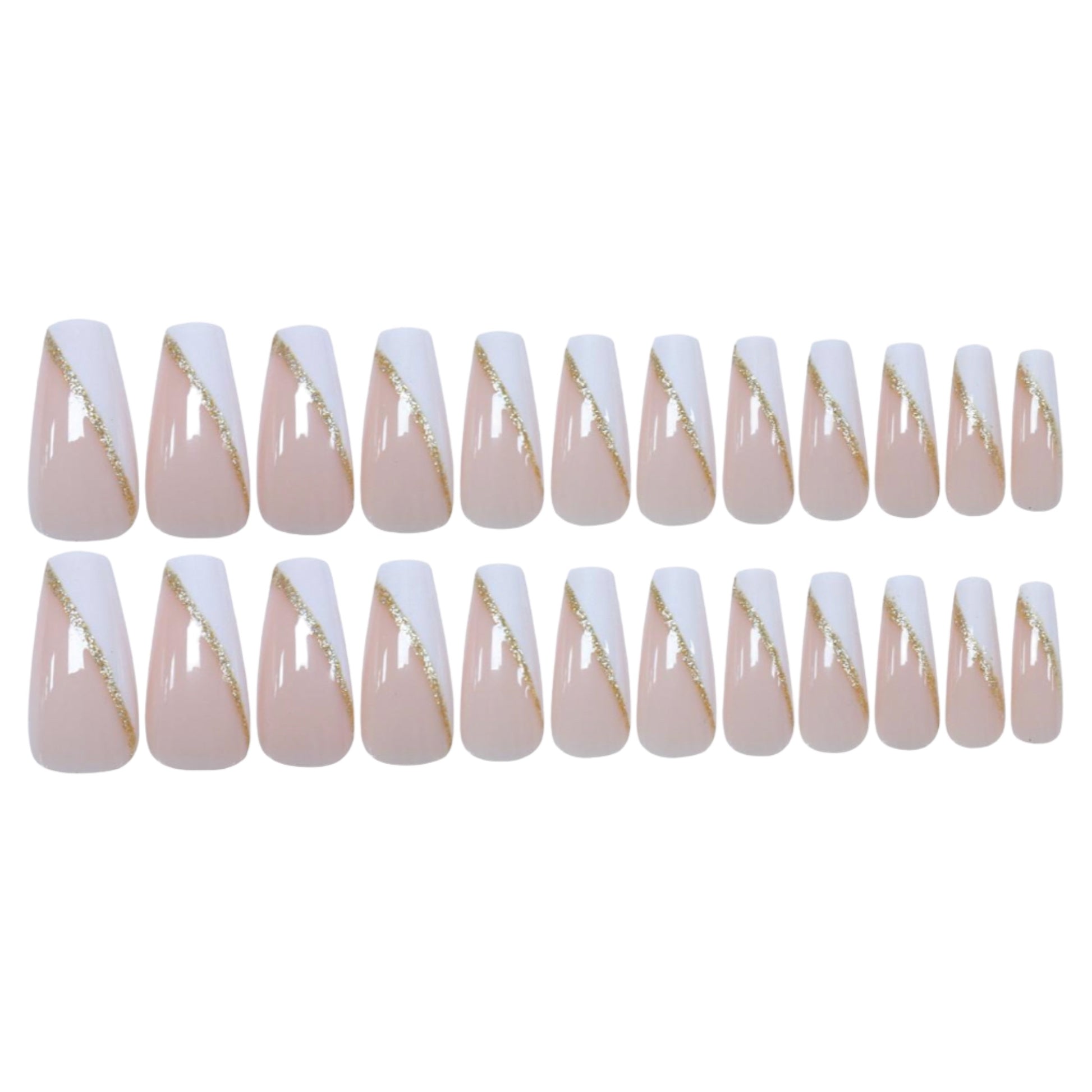 Indulge in regal elegance with Princess, our long coffin-shaped press-on nails in enchanting pink and white, adorned with luxurious gold accents. Crafted with high-quality precision, these nails guarantee a seamless fit around cuticles and the nail bed, ensuring a salon-perfect look. The gold accents gracefully extend to the tips, elevating your manicure to a royal statement. Princess not only captivates with its opulent design but also boasts durability, offering a remarkable two weeks of wear time. Embrace the allure of sophistication and lasting beauty—secure your royal transformation with Princess, where every detail reigns supreme. Limited stock, don't miss out! 👑💅